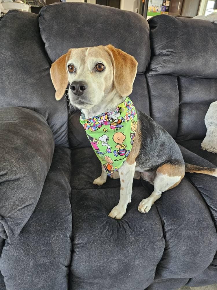 This fun Easter fabric has sold out three times already! And after exhaustive searching, we were able to get our hands on the last remaining yard. This is now the absolute last we'll have available. They're sewn with matching grass-green thread to make the design pop, and also sewn with an extra line at the top of the neck opening to give it a polished finish. We don't attach labels to our bandanas because we only want people to see your sweet furry one! Your pet's collar slides through the top, allowing the bandana to move freely on their back, around the front bandit-style, or somewhere in between. It eliminates the chewing or tugging of the tied ends of traditional bandanas.