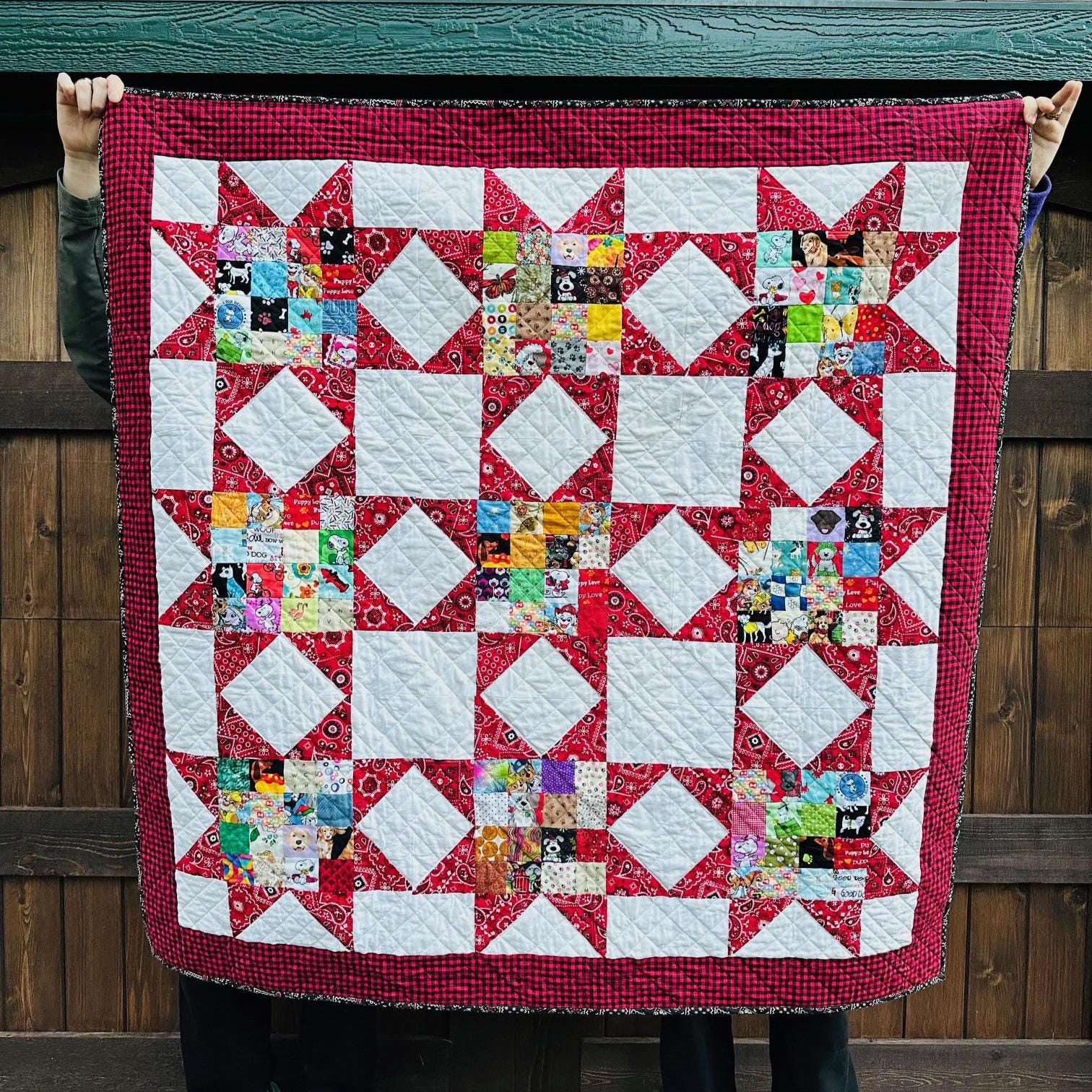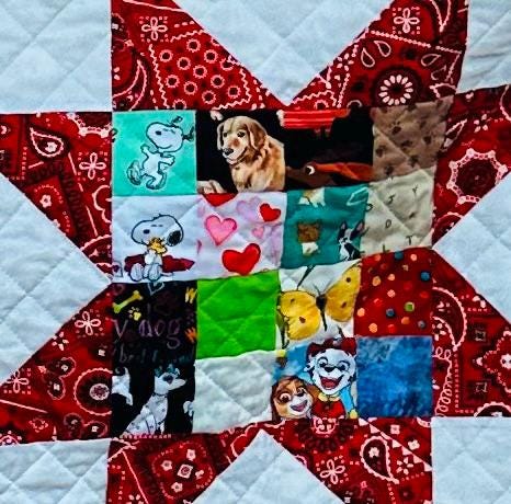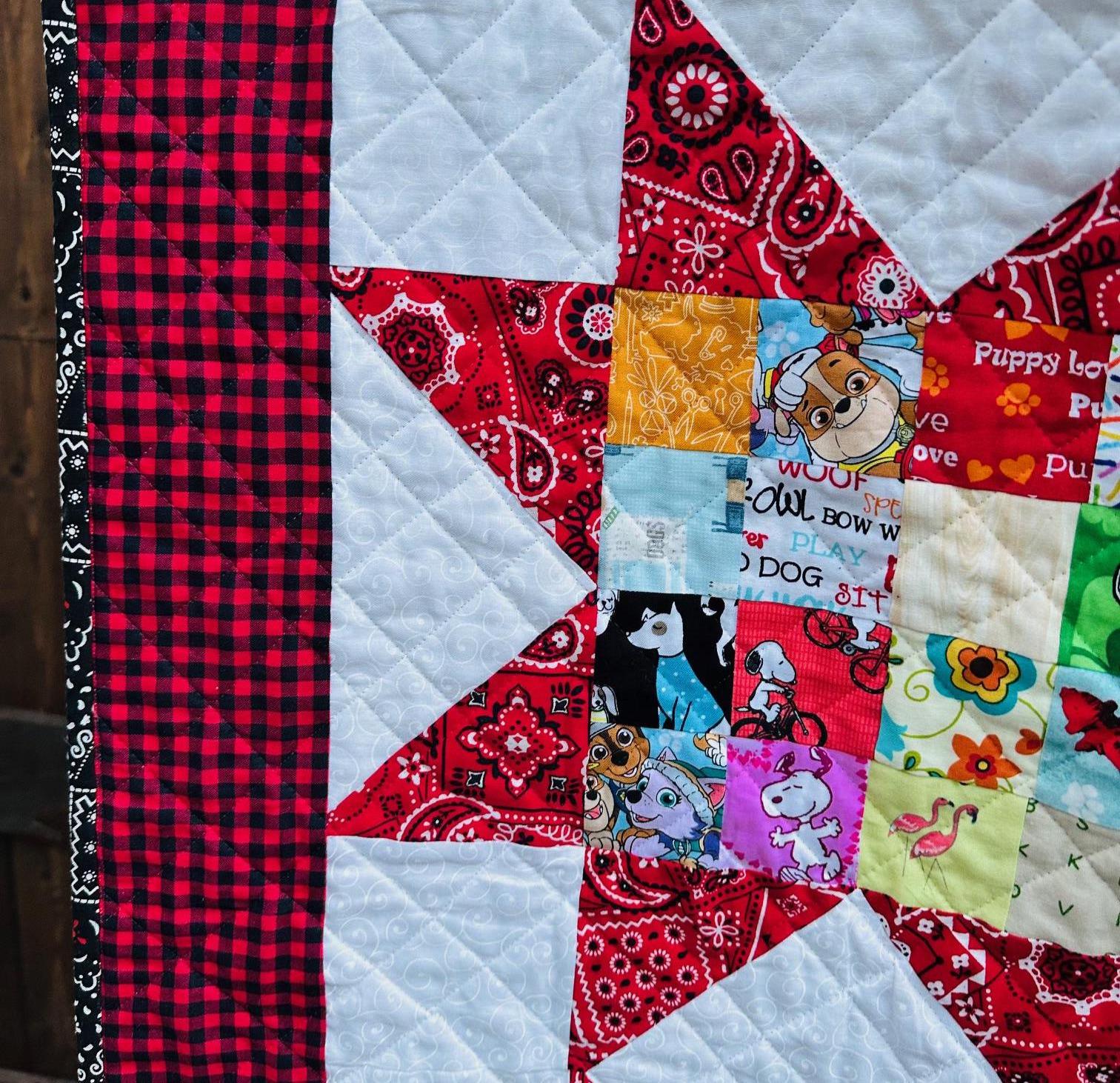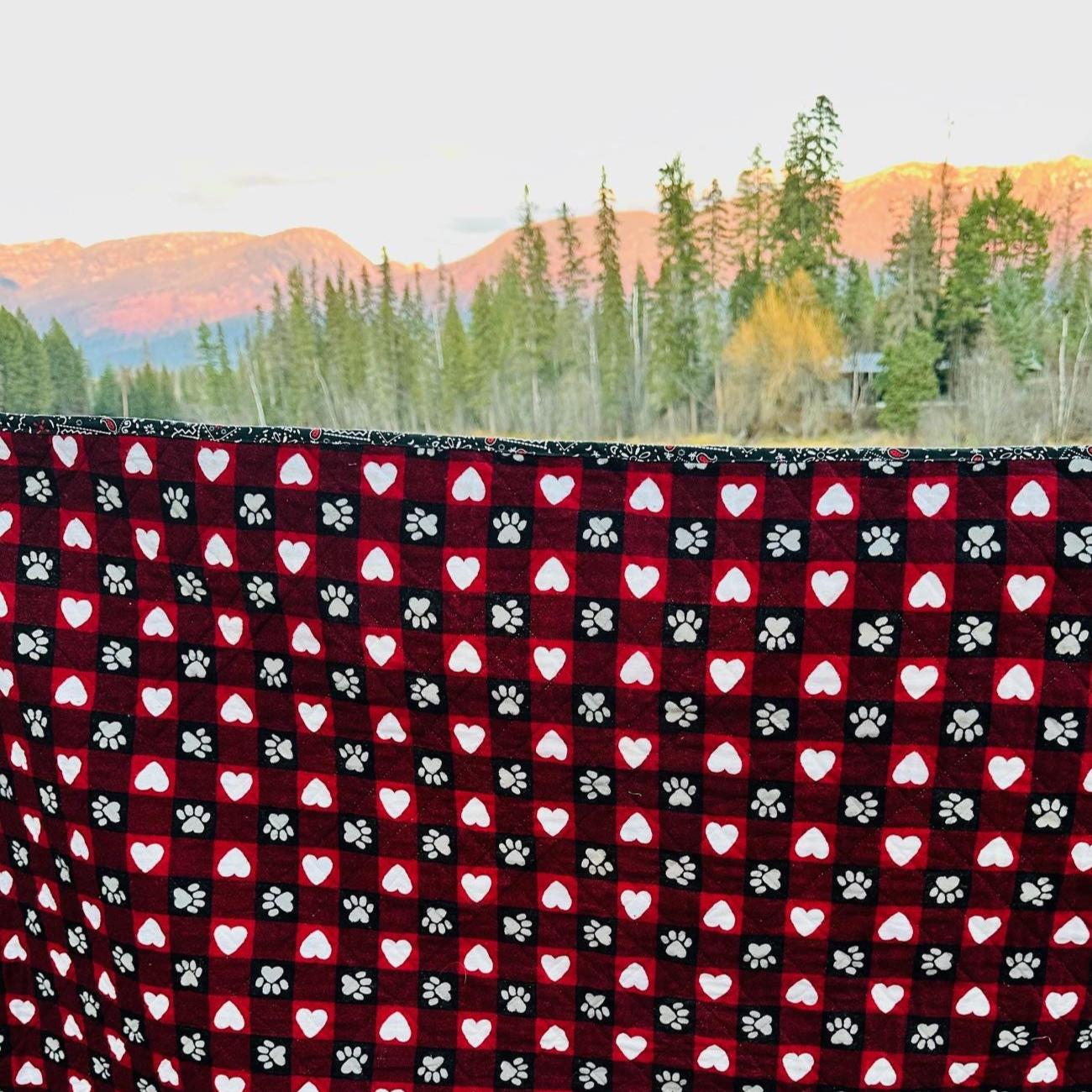 Is your dog the Star of the show ? Do you have a dog-lover in your life that you need the perfect gift for? Wanna level-up your doggy Christmas photos this year? Would you like to cozy up in a sweet, vibrant Buffalo Plaid print with happy doggos to discover? If the answer is "Yes" to any of these, then this is the one for you! With same day processing, and shipping straight from Bigfork Montana, we present this happy holiday quilt. Each little window frame is a fresh and happy discovery. And with the reverse side of lovey dogprints, it could be used any time of the year at all...not just the holidays...definitely Valentine's Day and beyond. Many of our customers use these for one of a kind photo backdrops or social media layouts, and this one would be awesome for that. Lots of Snoopy vignettes, Paw Patrol, many different dog breeds, and even Clifford. The quilt pictured is the very one you will receive--as there's only one! You'll receive it in gift-presentation at no extra charge. Made with care and love, in a non-smoking home with joyful mojo. It matters!
