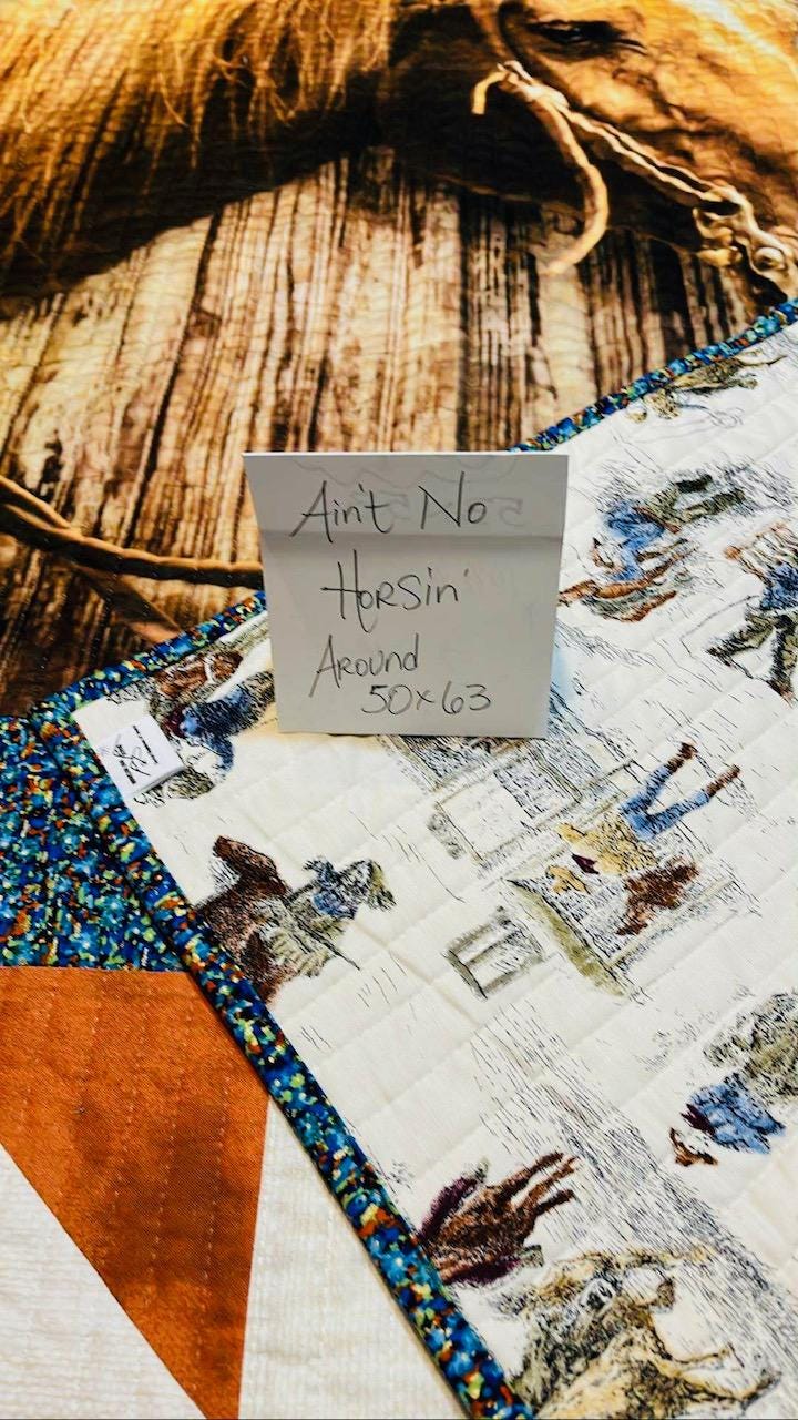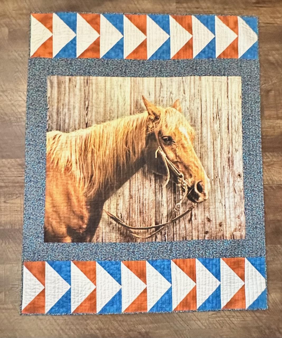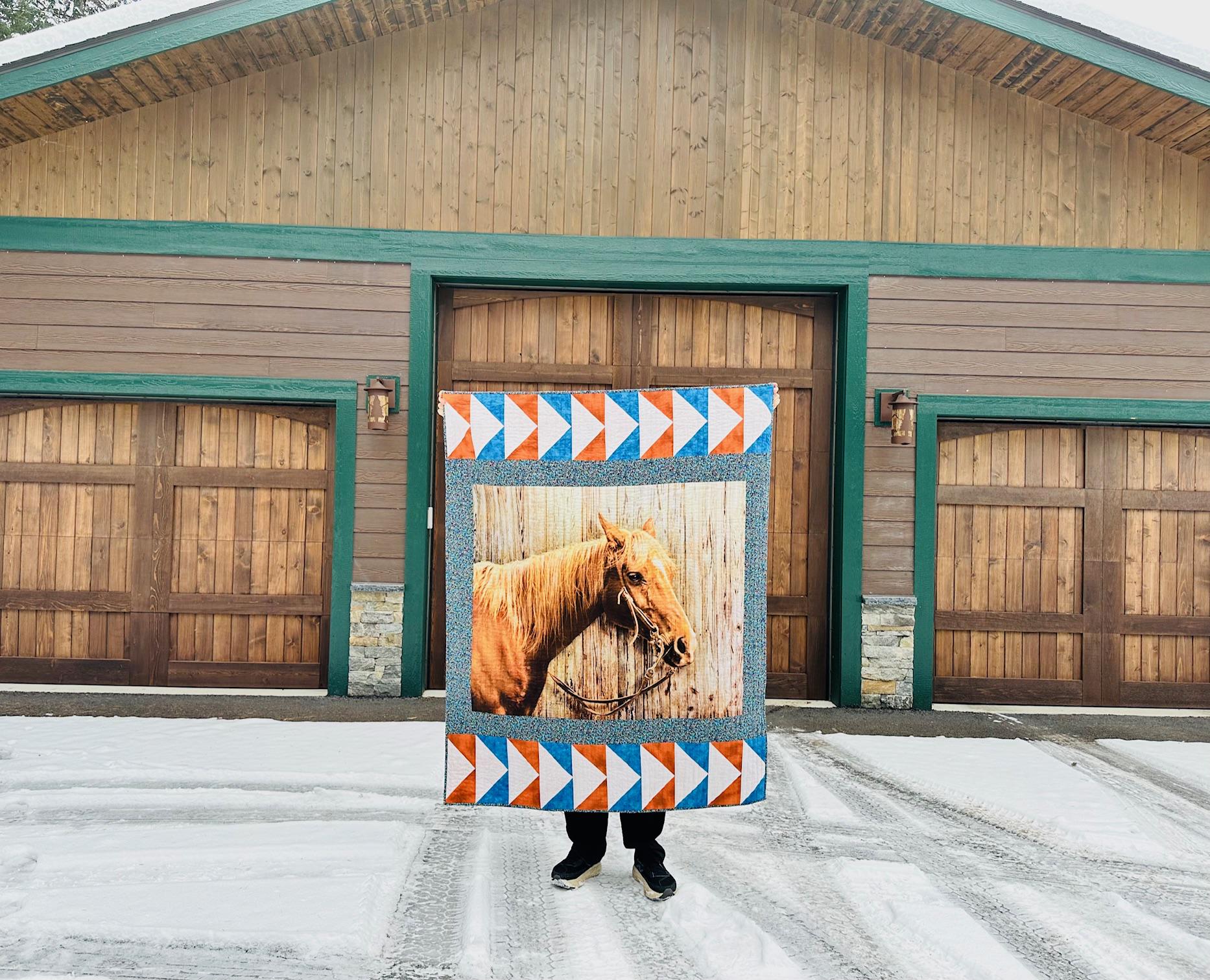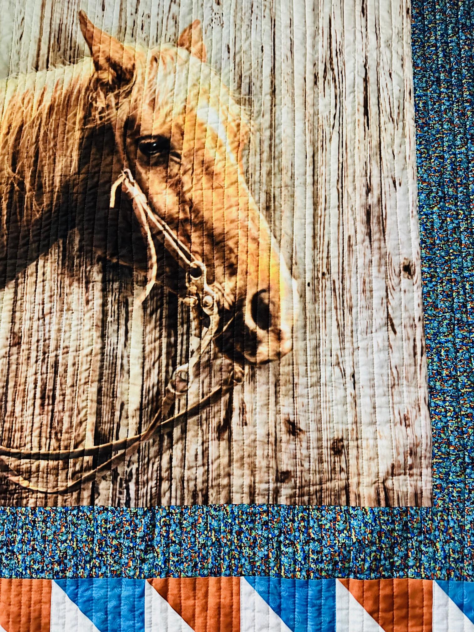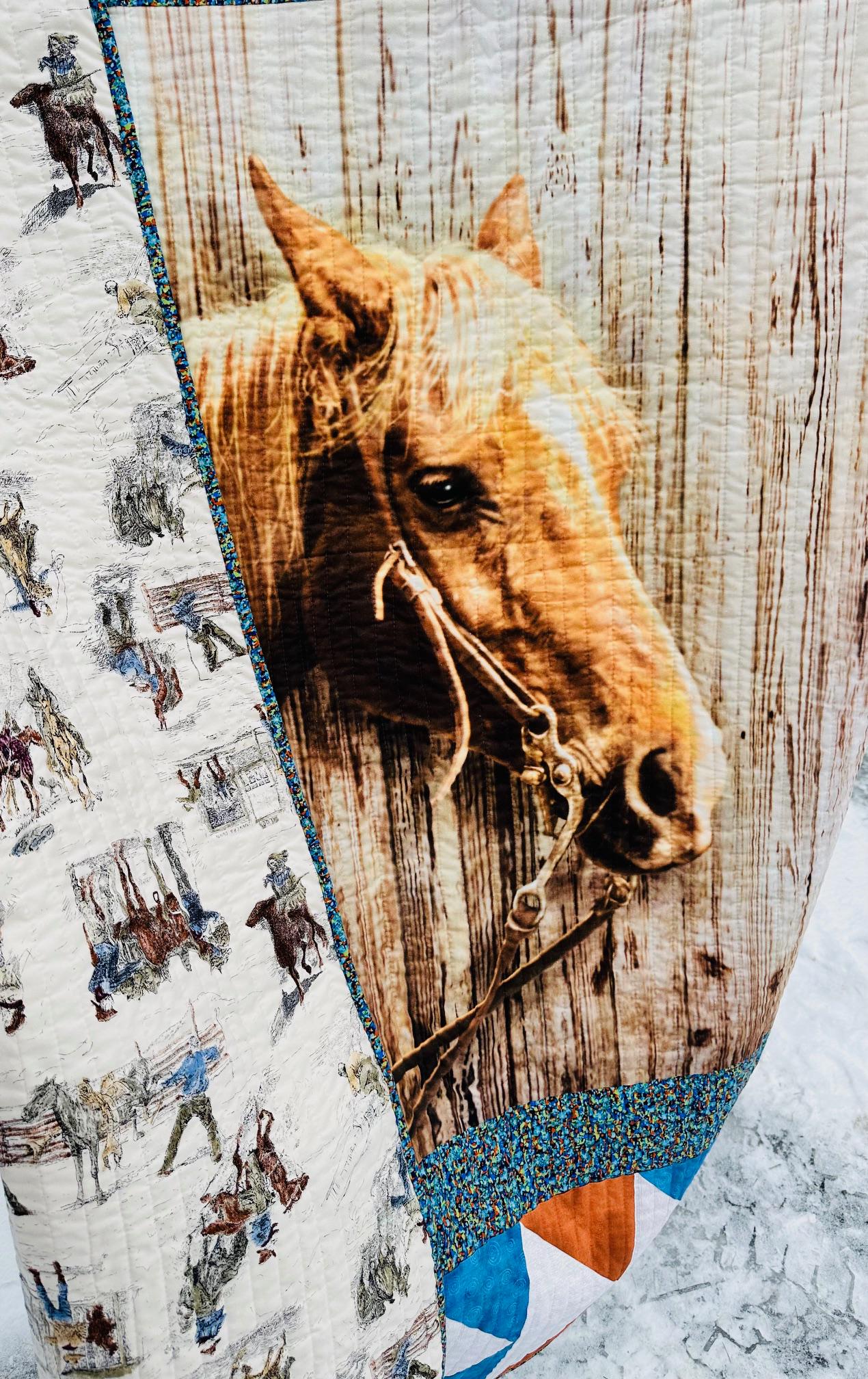 Our faithful fans asked for more animal quilts, and we aim to please! Ain't no horsin' around with this beauty...who can say "neigh" to it?? With same day processing, and shipping straight from our studio in Bigfork Montana, we present this reversible lovely that you can display with your barn decor, or snuggle up on the couch and laze the day away. It features the artwork of world-renowned artist Greg Giordino, and the "flying geese" quilting pattern. It would make a heartfelt gift for any horse lover in your life, Ranch family, or your favorite cowboy or cowgirl. Perfect for picnics, a backdrop for your 4-H project, parade banner, or western themed decorating. The beauty pictured is the very same quilt you will receive--there's only one. And you'll get to name him (or her!) Inside is a soft sandwich-layer of cotton batting, and the reverse features vintage cowboy scenes. You'll receive it in gift-presentation at no extra charge. Made with care and love, in a non-smoking home with joyful mojo. It matters!